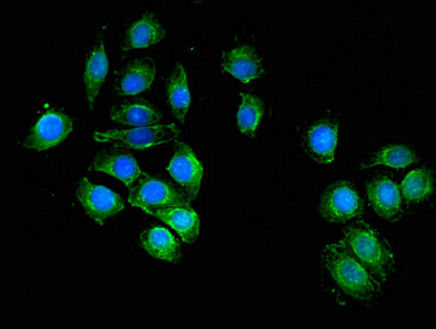 Immunofluorescent analysis of A549 cells using CSB-PA618067LA01HU at dilution of 1:100 and Alexa Fluor 488-congugated AffiniPure Goat Anti-Rabbit IgG(H+L)