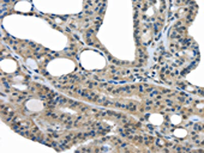 The image on the left is immunohistochemistry of paraffin-embedded Human thyroid cancer tissue using CSB-PA257638(UCHL3 Antibody) at dilution 1/35, on the right is treated with fusion protein. (Original magnification: ×200)
