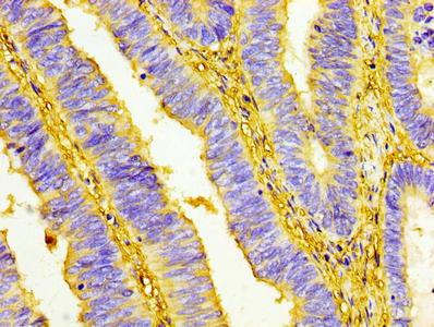 IHC image of CSB-PA025554LA01HU diluted at 1:100 and staining in paraffin-embedded human colon cancer performed on a Leica BondTM system. After dewaxing and hydration, antigen retrieval was mediated by high pressure in a citrate buffer (pH 6.0). Section was blocked with 10% normal goat serum 30min at RT. Then primary antibody (1% BSA) was incubated at 4°C overnight. The primary is detected by a biotinylated secondary antibody and visualized using an HRP conjugated SP system.