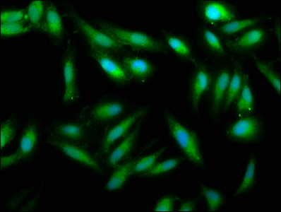 Immunofluorescence staining of Hela cells with CSB-PA728898LA01HU at 1:33, counter-stained with DAPI. The cells were fixed in 4% formaldehyde, permeabilized using 0.2% Triton X-100 and blocked in 10% normal Goat Serum. The cells were then incubated with the antibody overnight at 4°C. The secondary antibody was Alexa Fluor 488-congugated AffiniPure Goat Anti-Rabbit IgG(H+L).