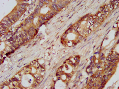 IHC image of CSB-PA728898LA01HU diluted at 1:100 and staining in paraffin-embedded human colon cancer performed on a Leica BondTM system. After dewaxing and hydration, antigen retrieval was mediated by high pressure in a citrate buffer (pH 6.0). Section was blocked with 10% normal goat serum 30min at RT. Then primary antibody (1% BSA) was incubated at 4°C overnight. The primary is detected by a biotinylated secondary antibody and visualized using an HRP conjugated SP system.