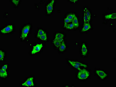 Immunofluorescent analysis of HepG2 cells using CSB-PA603875LA01HU at dilution of 1:100 and Alexa Fluor 488-congugated AffiniPure Goat Anti-Rabbit IgG(H+L)
