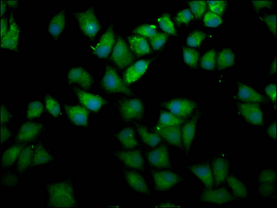 Immunofluorescence staining of Hela cells with CSB-PA883646LA01HU at 1:166, counter-stained with DAPI. The cells were fixed in 4% formaldehyde, permeabilized using 0.2% Triton X-100 and blocked in 10% normal Goat Serum. The cells were then incubated with the antibody overnight at 4°C. The secondary antibody was Alexa Fluor 488-congugated AffiniPure Goat Anti-Rabbit IgG(H+L).