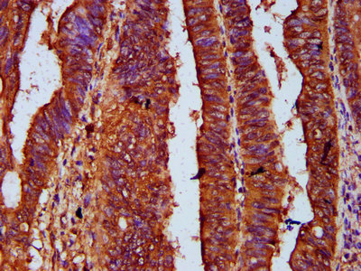 IHC image of CSB-PA883646LA01HU diluted at 1:500 and staining in paraffin-embedded human colon cancer performed on a Leica BondTM system. After dewaxing and hydration, antigen retrieval was mediated by high pressure in a citrate buffer (pH 6.0). Section was blocked with 10% normal goat serum 30min at RT. Then primary antibody (1% BSA) was incubated at 4°C overnight. The primary is detected by a biotinylated secondary antibody and visualized using an HRP conjugated SP system.