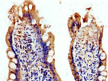 IHC image of CSB-PA774808LA01HU diluted at 1:200 and staining in paraffin-embedded human small intestine tissue performed on a Leica BondTM system. After dewaxing and hydration, antigen retrieval was mediated by high pressure in a citrate buffer (pH 6.0). Section was blocked with 10% normal goat serum 30min at RT. Then primary antibody (1% BSA) was incubated at 4°C overnight. The primary is detected by a biotinylated secondary antibody and visualized using an HRP conjugated SP system.