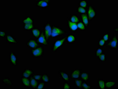 Immunofluorescence staining of Hela cells with CSB-PA856610LA01HU at 1:100, counter-stained with DAPI. The cells were fixed in 4% formaldehyde, permeabilized using 0.2% Triton X-100 and blocked in 10% normal Goat Serum. The cells were then incubated with the antibody overnight at 4°C. The secondary antibody was Alexa Fluor 488-congugated AffiniPure Goat Anti-Rabbit IgG(H+L).