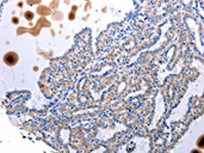 The image is immunohistochemistry of paraffin-embedded Human thyroid cancer tissue using CSB-PA779618(UTS2 Antibody) at dilution 1/100. (Original magnification: ×200)