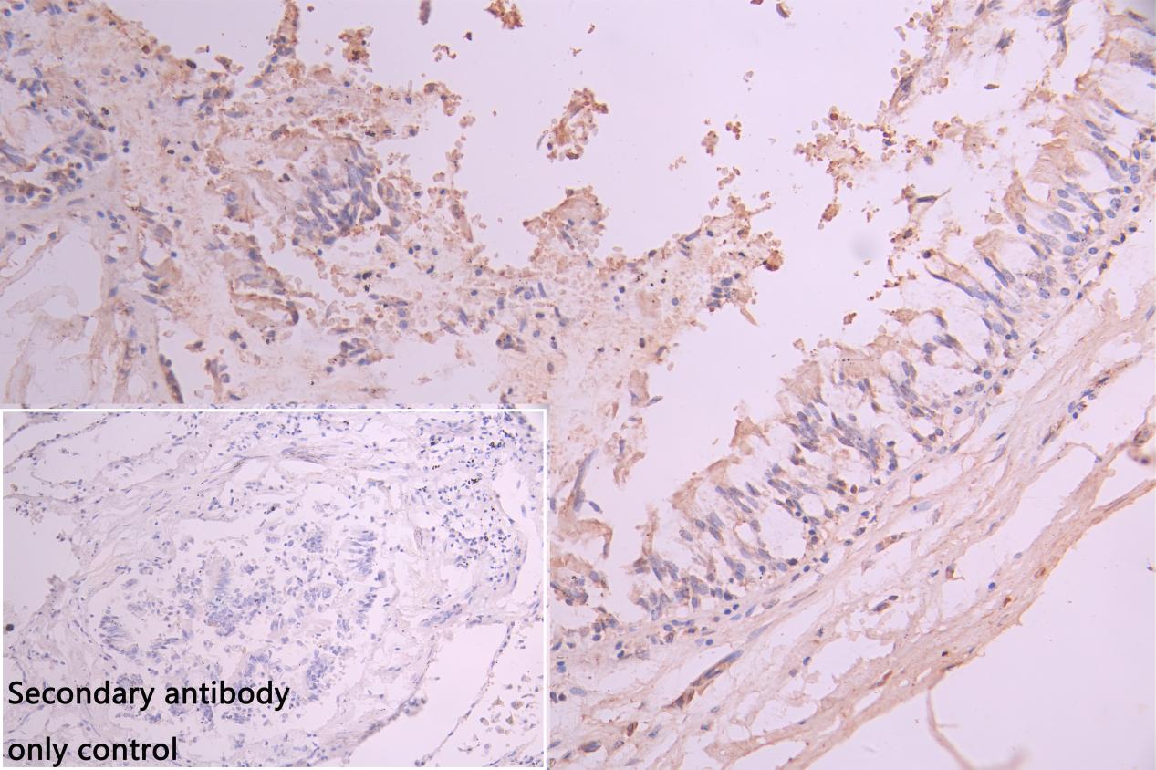 IHC image of CSB-PA822754LA01HU diluted at 1:50 and staining in paraffin-embedded human Lung tissue performed on a Leica BondTM system. After dewaxing and hydration, antigen retrieval was mediated by high pressure in a citrate buffer (pH 6.0). Section was blocked with 10% normal goat serum 30min at RT. Then primary antibody (1% BSA) was incubated at 4°C overnight. The primary is detected by a Goat anti-rabbit polymer IgG labeled by HRP and visualized using 0.05% DAB. Secondary antibody only control: uses 1% BSA instead of primary antibody
