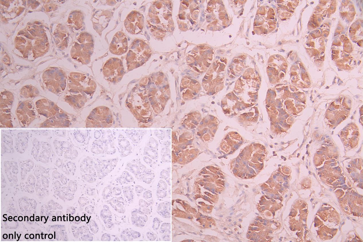 IHC image of CSB-PA822754LA01HU diluted at 1:50 and staining in paraffin-embedded human Stomach tissue performed on a Leica BondTM system. After dewaxing and hydration, antigen retrieval was mediated by high pressure in a citrate buffer (pH 6.0). Section was blocked with 10% normal goat serum 30min at RT. Then primary antibody (1% BSA) was incubated at 4°C overnight. The primary is detected by a Goat anti-rabbit polymer IgG labeled by HRP and visualized using 0.05% DAB. Secondary antibody only control: uses 1% BSA instead of primary antibody