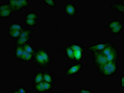 Immunofluorescent analysis of HepG2 cells using CSB-PA025785LA01HU at dilution of 1:100 and Alexa Fluor 488-congugated AffiniPure Goat Anti-Rabbit IgG(H+L)