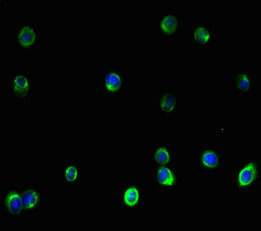 Immunofluorescent analysis of HepG2 cells using CSB-PA025857LA01HU at dilution of 1:100 and Alexa Fluor 488-congugated AffiniPure Goat Anti-Rabbit IgG(H+L)