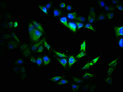 Immunofluorescence staining of Hela cells with CSB-PA888005LA01HU at 1:200, counter-stained with DAPI. The cells were fixed in 4% formaldehyde, permeabilized using 0.2% Triton X-100 and blocked in 10% normal Goat Serum. The cells were then incubated with the antibody overnight at 4°C. The secondary antibody was Alexa Fluor 488-congugated AffiniPure Goat Anti-Rabbit IgG(H+L).