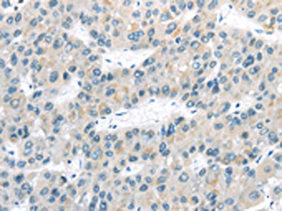 The image on the left is immunohistochemistry of paraffin-embedded Human liver cancer tissue using CSB-PA830584(VLDLR Antibody) at dilution 1/40, on the right is treated with synthetic peptide. (Original magnification: ×200)