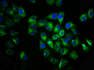 Immunofluorescence staining of Hela cells with CSB-PA861973LA01HU at 1:133, counter-stained with DAPI. The cells were fixed in 4% formaldehyde, permeabilized using 0.2% Triton X-100 and blocked in 10% normal Goat Serum. The cells were then incubated with the antibody overnight at 4°C. The secondary antibody was Alexa Fluor 488-congugated AffiniPure Goat Anti-Rabbit IgG(H+L).