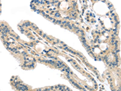The image on the left is immunohistochemistry of paraffin-embedded Human thyroid cancer tissue using CSB-PA234289(VPS26A Antibody) at dilution 1/40, on the right is treated with synthetic peptide. (Original magnification: ×200)