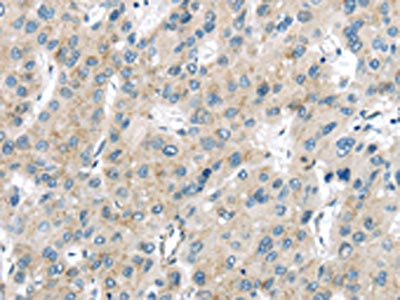 The image on the left is immunohistochemistry of paraffin-embedded Human liver cancer tissue using CSB-PA234289(VPS26A Antibody) at dilution 1/40, on the right is treated with synthetic peptide. (Original magnification: ×200)