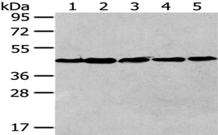 Gel: 8%SDS-PAGE,Lysate: 40 μg,Lane 1-5: Human liver cancer tissue, 293T cells, A172 cells, Hela cells, MCF7 cells,Primary antibody: CSB-PA940983(VPS4A Antibody) at dilution 1/200 dilution,Secondary antibody: Goat anti rabbit IgG at 1/8000 dilution,Exposure time: 1 minute