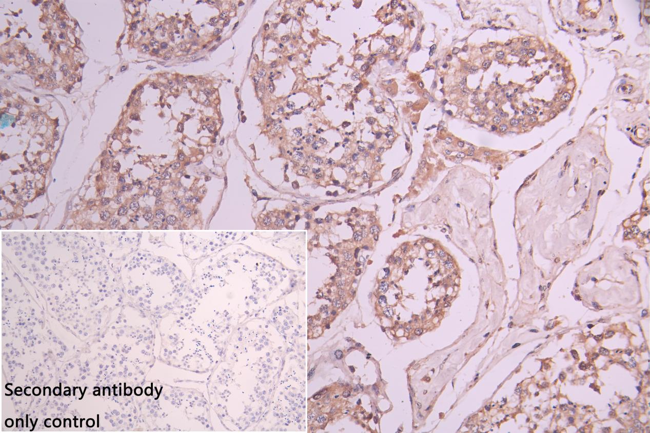 IHC image of CSB-PA891974DSR2HU diluted at 1:100 and staining in paraffin-embedded human testis tissue performed on a Leica BondTM system. After dewaxing and hydration, antigen retrieval was mediated by high pressure in a citrate buffer (pH 6.0). Section was blocked with 10% normal goat serum 30min at RT. Then primary antibody (1% BSA) was incubated at 4°C overnight. The primary is detected by a Goat anti-rabbit polymer IgG labeled by HRP and visualized using 0.05% DAB. Secondary antibody only control: uses 1% BSA instead of primary antibody