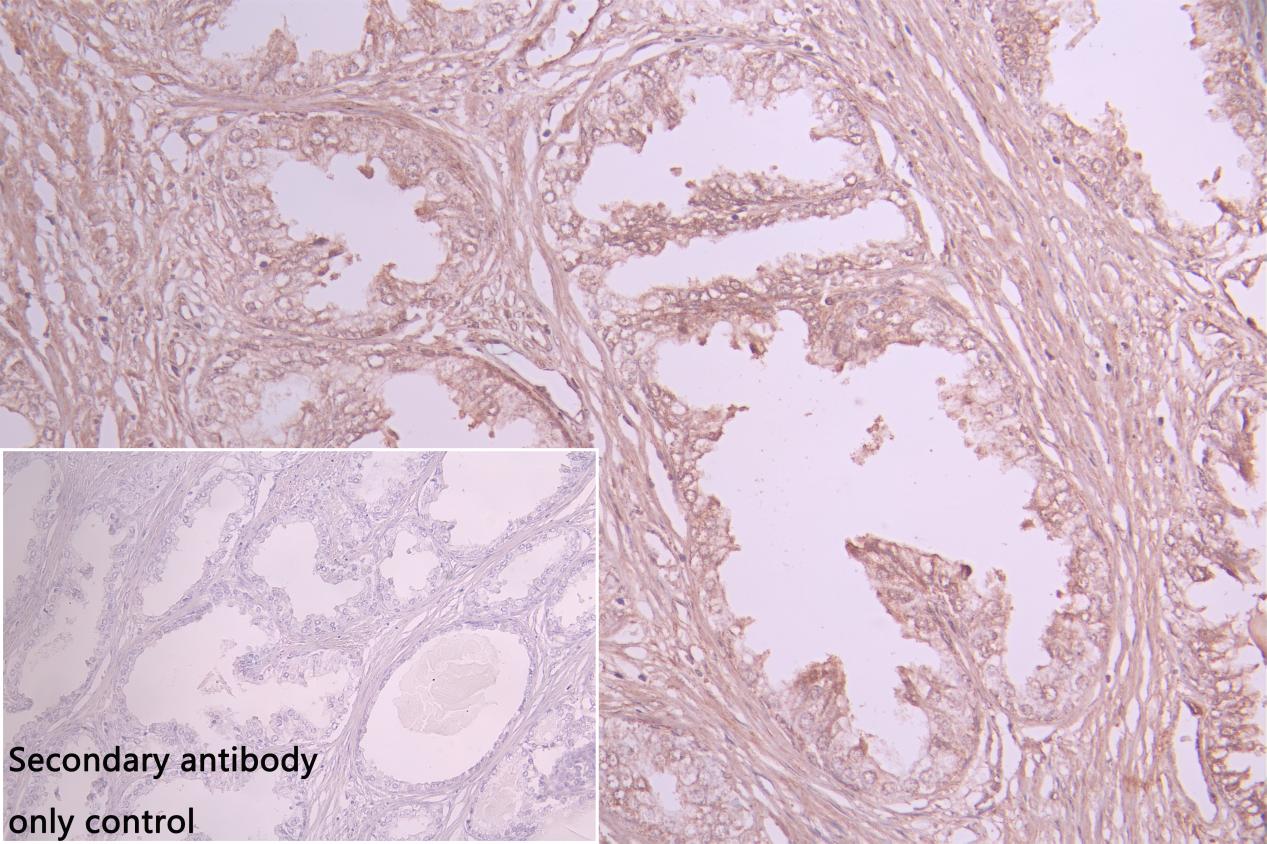 IHC image of CSB-PA891974DSR2HU diluted at 1:100 and staining in paraffin-embedded human prostate cancer performed on a Leica BondTM system. After dewaxing and hydration, antigen retrieval was mediated by high pressure in a citrate buffer (pH 6.0). Section was blocked with 10% normal goat serum 30min at RT. Then primary antibody (1% BSA) was incubated at 4°C overnight. The primary is detected by a Goat anti-rabbit polymer IgG labeled by HRP and visualized using 0.05% DAB. Secondary antibody only control: uses 1% BSA instead of primary antibody