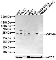 The purified VPS4A polyclonal antibody has been characterized by ELISA, WB, and IHC to confirm their specificity and sensitivity to VPS4A. This antibody can react with human, mouse, and rat VPS4A proteins. VPS4A mainly catalyzes the disassembly of ESCRT complexes, which are involved in the sorting and trafficking of membrane proteins in the endocytic pathway. It is also implicated in cytokinesis and virus budding.
