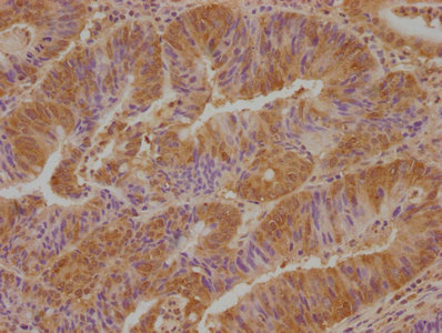 IHC image of CSB-PA842721LA01HU diluted at 1:100 and staining in paraffin-embedded human colon cancer performed on a Leica BondTM system. After dewaxing and hydration, antigen retrieval was mediated by high pressure in a citrate buffer (pH 6.0). Section was blocked with 10% normal goat serum 30min at RT. Then primary antibody (1% BSA) was incubated at 4°C overnight. The primary is detected by a biotinylated secondary antibody and visualized using an HRP conjugated SP system.