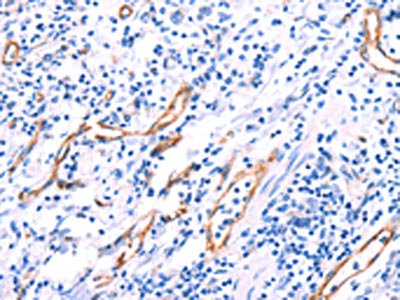 The image on the left is immunohistochemistry of paraffin-embedded Human gastic cancer tissue using CSB-PA195869(VWF Antibody) at dilution 1/50, on the right is treated with fusion protein. (Original magnification: ×200)