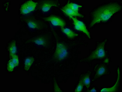 Immunofluorescence staining of U251 cells with CSB-PA864011LA01HU at 1:166, counter-stained with DAPI. The cells were fixed in 4% formaldehyde, permeabilized using 0.2% Triton X-100 and blocked in 10% normal Goat Serum. The cells were then incubated with the antibody overnight at 4°C. The secondary antibody was Alexa Fluor 488-congugated AffiniPure Goat Anti-Rabbit IgG(H+L).