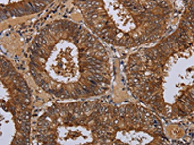 The image on the left is immunohistochemistry of paraffin-embedded Human colon cancer tissue using CSB-PA552938(WDR83 Antibody) at dilution 1/60, on the right is treated with fusion protein. (Original magnification: ×200)