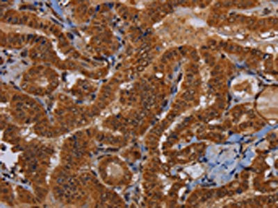 The image on the left is immunohistochemistry of paraffin-embedded Human thyroid cancer tissue using CSB-PA552938(WDR83 Antibody) at dilution 1/60, on the right is treated with fusion protein. (Original magnification: ×200)