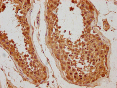IHC image of CSB-PA822265LA01HU diluted at 1:500 and staining in paraffin-embedded human testis tissue performed on a Leica BondTM system. After dewaxing and hydration, antigen retrieval was mediated by high pressure in a citrate buffer (pH 6.0). Section was blocked with 10% normal goat serum 30min at RT. Then primary antibody (1% BSA) was incubated at 4°C overnight. The primary is detected by a biotinylated secondary antibody and visualized using an HRP conjugated SP system.