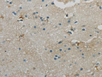 The image on the left is immunohistochemistry of paraffin-embedded Human brain tissue using CSB-PA565878(WNK1 Antibody) at dilution 1/25, on the right is treated with synthetic peptide. (Original magnification: ×200)