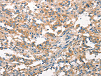 The image on the left is immunohistochemistry of paraffin-embedded Human thyroid cancer tissue using CSB-PA832503(WNK3 Antibody) at dilution 1/20, on the right is treated with synthetic peptide. (Original magnification: ×200)