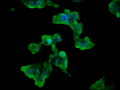 Immunofluorescence staining of 293 cells with CSB-PA861176LA01HU at 1:100, counter-stained with DAPI. The cells were fixed in 4% formaldehyde, permeabilized using 0.2% Triton X-100 and blocked in 10% normal Goat Serum. The cells were then incubated with the antibody overnight at 4°C. The secondary antibody was Alexa Fluor 488-congugated AffiniPure Goat Anti-Rabbit IgG(H+L).