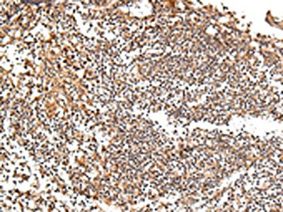 The image on the left is immunohistochemistry of paraffin-embedded Human tonsil tissue using CSB-PA093573(XKR7 Antibody) at dilution 1/20, on the right is treated with synthetic peptide. (Original magnification: ×200)