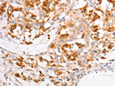 The image on the left is immunohistochemistry of paraffin-embedded Human gastic cancer tissue using CSB-PA903762(YARS2 Antibody) at dilution 1/20, on the right is treated with fusion protein. (Original magnification: ×200)