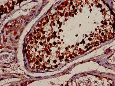 IHC image of CSB-PA01544A0Rb diluted at 1:600 and staining in paraffin-embedded human testis tissue performed on a Leica BondTM system. After dewaxing and hydration, antigen retrieval was mediated by high pressure in a citrate buffer (pH 6.0). Section was blocked with 10% normal goat serum 30min at RT. Then primary antibody (1% BSA) was incubated at 4°C overnight. The primary is detected by a biotinylated secondary antibody and visualized using an HRP conjugated SP system.