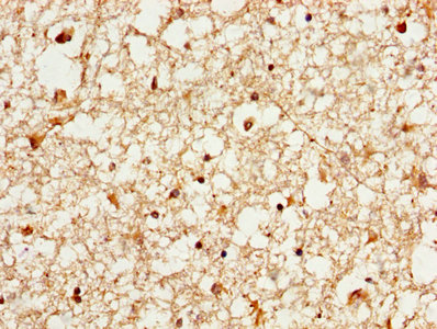 IHC image of CSB-PA026287DA01HU diluted at 1:1000 and staining in paraffin-embedded human brain tissue performed on a Leica BondTM system. After dewaxing and hydration, antigen retrieval was mediated by high pressure in a citrate buffer (pH 6.0). Section was blocked with 10% normal goat serum 30min at RT. Then primary antibody (1% BSA) was incubated at 4°C overnight. The primary is detected by a biotinylated secondary antibody and visualized using an HRP conjugated SP system.