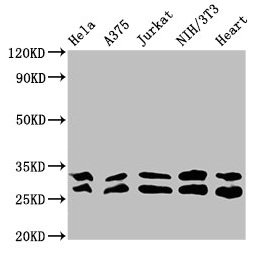 Positive WB detected in: Hela whole cell lysate, A375 whole cell lysate, Jurkat whole cell lysate, NIH/3T3 whole cell lysate, Mouse heart tissue