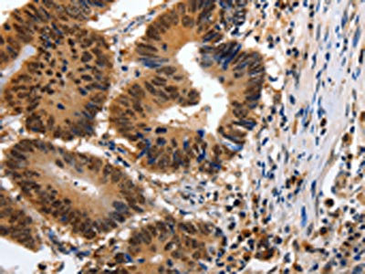 The image on the left is immunohistochemistry of paraffin-embedded Human colon cancer tissue using CSB-PA902567(YWHAE Antibody) at dilution 1/100, on the right is treated with synthetic peptide. (Original magnification: ×200)