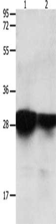Gel: 12%SDS-PAGE, Lysate: 40 μg, Lane 1-2: Human brain malignant glioma tissue, Human laryngocarcinoma tissue, Primary antibody: CSB-PA902567(YWHAE Antibody) at dilution 1/2200, Secondary antibody: Goat anti rabbit IgG at 1/8000 dilution, Exposure time: 30 seconds