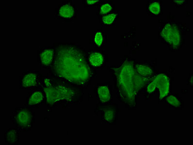 Immunofluorescence staining of MCF-7 cells with CSB-PA850841LA01HU at 1:66, counter-stained with DAPI. The cells were fixed in 4% formaldehyde, permeabilized using 0.2% Triton X-100 and blocked in 10% normal Goat Serum. The cells were then incubated with the antibody overnight at 4°C. The secondary antibody was Alexa Fluor 488-congugated AffiniPure Goat Anti-Rabbit IgG(H+L).