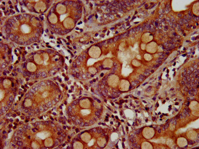 IHC image of CSB-PA850433LA01HU diluted at 1:200 and staining in paraffin-embedded human small intestine tissue performed on a Leica BondTM system. After dewaxing and hydration, antigen retrieval was mediated by high pressure in a citrate buffer (pH 6.0). Section was blocked with 10% normal goat serum 30min at RT. Then primary antibody (1% BSA) was incubated at 4°C overnight. The primary is detected by a biotinylated secondary antibody and visualized using an HRP conjugated SP system.