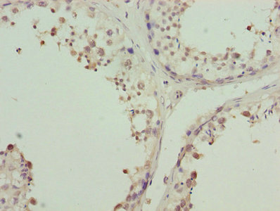 Immunohistochemistry of paraffin-embedded human testis tissue using CSB-PA026622ESR2HU at dilution of 1:100