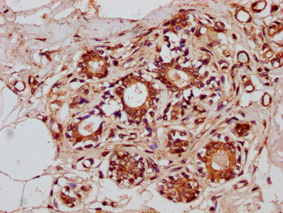 IHC image of CSB-PA026651LA01HU diluted at 1:300 and staining in paraffin-embedded human breast cancer performed on a Leica BondTM system. After dewaxing and hydration, antigen retrieval was mediated by high pressure in a citrate buffer (pH 6.0). Section was blocked with 10% normal goat serum 30min at RT. Then primary antibody (1% BSA) was incubated at 4°C overnight. The primary is detected by a biotinylated secondary antibody and visualized using an HRP conjugated SP system.