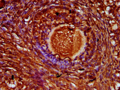 IHC image of CSB-PA621518LA01HU diluted at 1:300 and staining in paraffin-embedded human ovarian tissue performed on a Leica BondTM system. After dewaxing and hydration, antigen retrieval was mediated by high pressure in a citrate buffer (pH 6.0). Section was blocked with 10% normal goat serum 30min at RT. Then primary antibody (1% BSA) was incubated at 4°C overnight. The primary is detected by a biotinylated secondary antibody and visualized using an HRP conjugated SP system.
