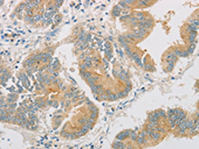 The image on the left is immunohistochemistry of paraffin-embedded Human colon cancer tissue using CSB-PA781119(ZWINT Antibody) at dilution 1/50, on the right is treated with fusion protein. (Original magnification: ×200)