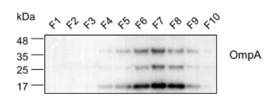 產品評價: 我使用CSB-PA359226ZA01EOD抗體,對E.coli分泌的細菌胞外囊泡進行WB檢測,在不同密度梯度離心組分中,OmpA蛋白主要在6-8組分富集,條帶位置主要在35 kDa附近。