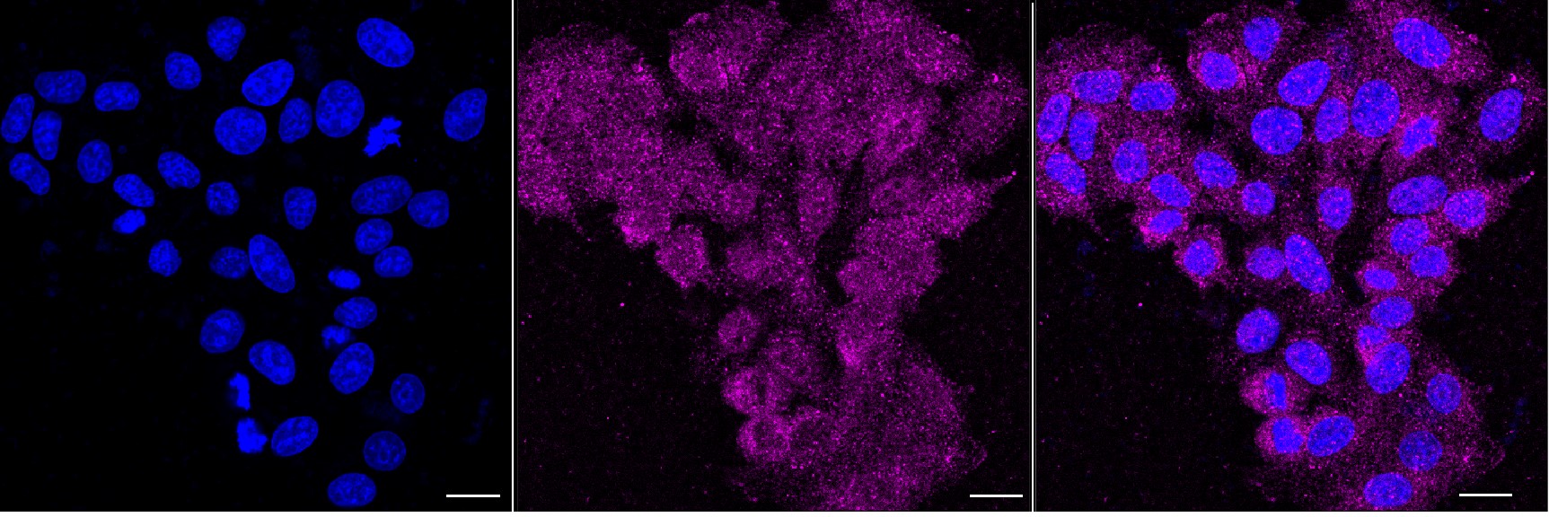 Immunocytochemical staining of HepG2 cells with ABCE1 antibody. Nuclei were stained blue with DAPI; ABCE1 was stained magenta with Alexa Fluor? 647. Images were taken using Leica stellaris 5. Protein abundance based on laser Intensity and smart gain: Low. Scale bar, 20 μm.