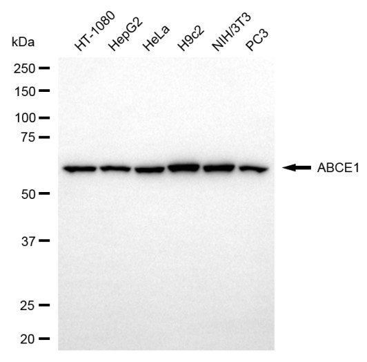 Western blotting analysis using ABCE1 antibody. Total cell lysates (30 μg) from various cell lines were loaded and separated by SDS-PAGE. The blot was incubated with ABCE1 antibody and HRP-conjugated goat anti-rabbit secondary antibody respectively.