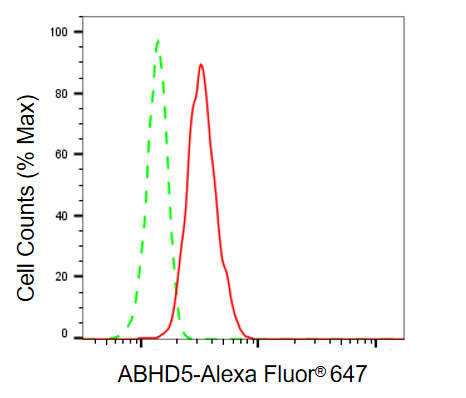Flow cytometric analysis of ABHD5 expression in C2C12 cells using ABHD5 antibody. Green, isotype control; red, ABHD5.